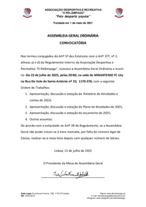 Convocam-se todos os associados para a Assembleia Geral Ordinária, a realizar-se no dia 23 de julho de 2025, pelas 19:30, na sede do MIRANTENSE FC sito na Rua Do Vale de Santo António nº 33, 1170-376, Lisboa, com a seguinte ordem de trabalho